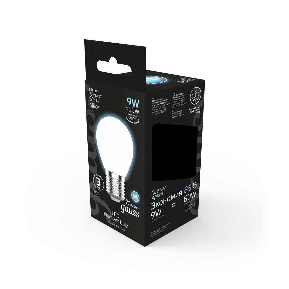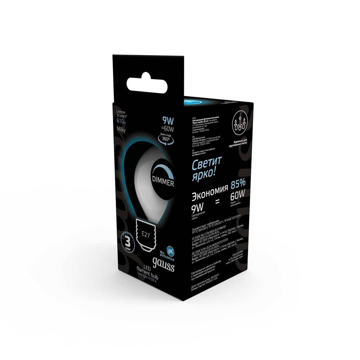 Лампа светодиодная филаментная Gauss E27 9W 4100К матовая 105202209