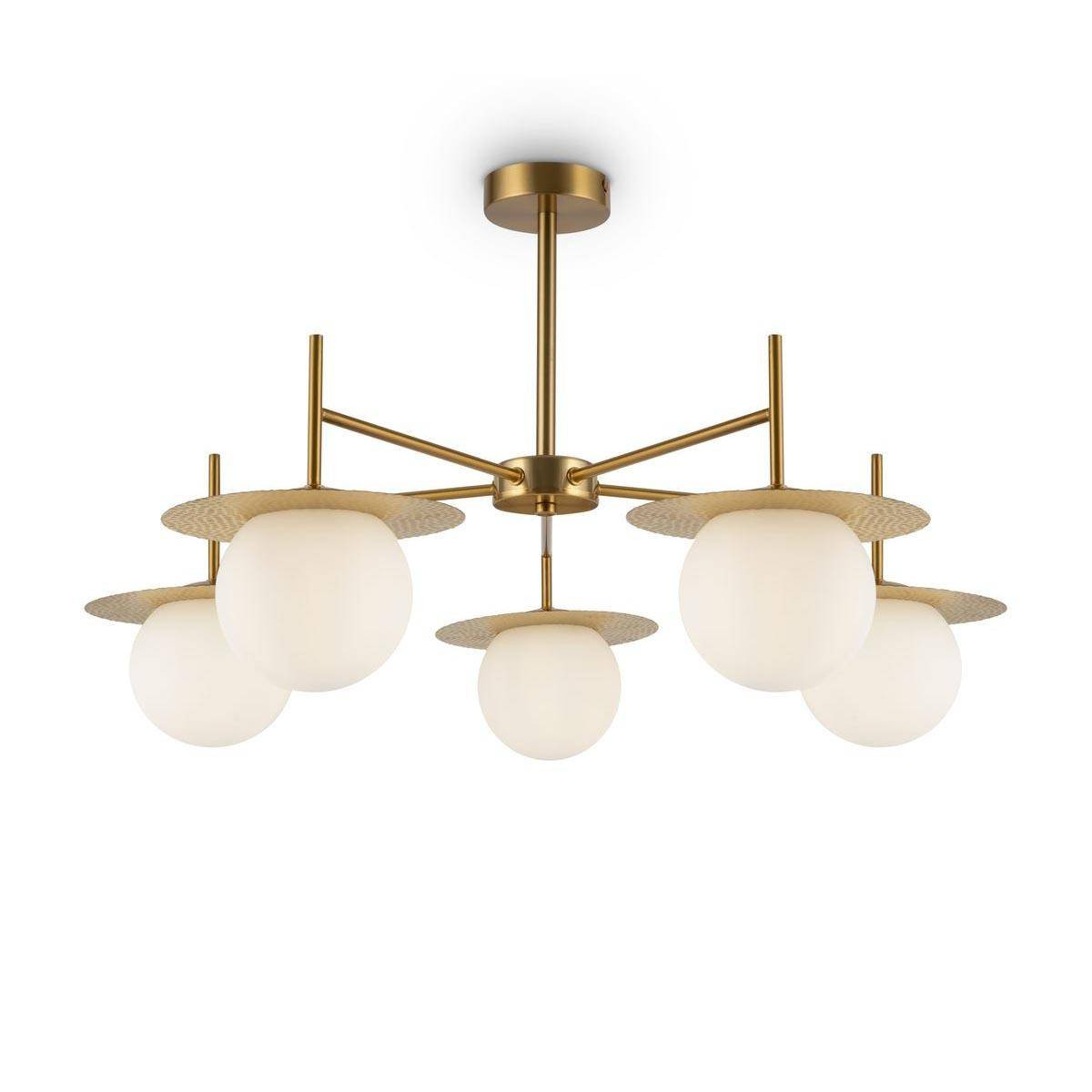 С помощью этой потолочной люстры вы сможете насладиться освещением для квартиры или освещением для дома в разных помещениях, будь то спальня, гостиная или кухня. Мощность в 300W и совместимость с лампами типа E27 позволяют создать уютную атмосферу. Плафоны выполнены в белом цвете, что добавляет дополнительную легкость, а латунная арматура обеспечивает нотку роскоши.