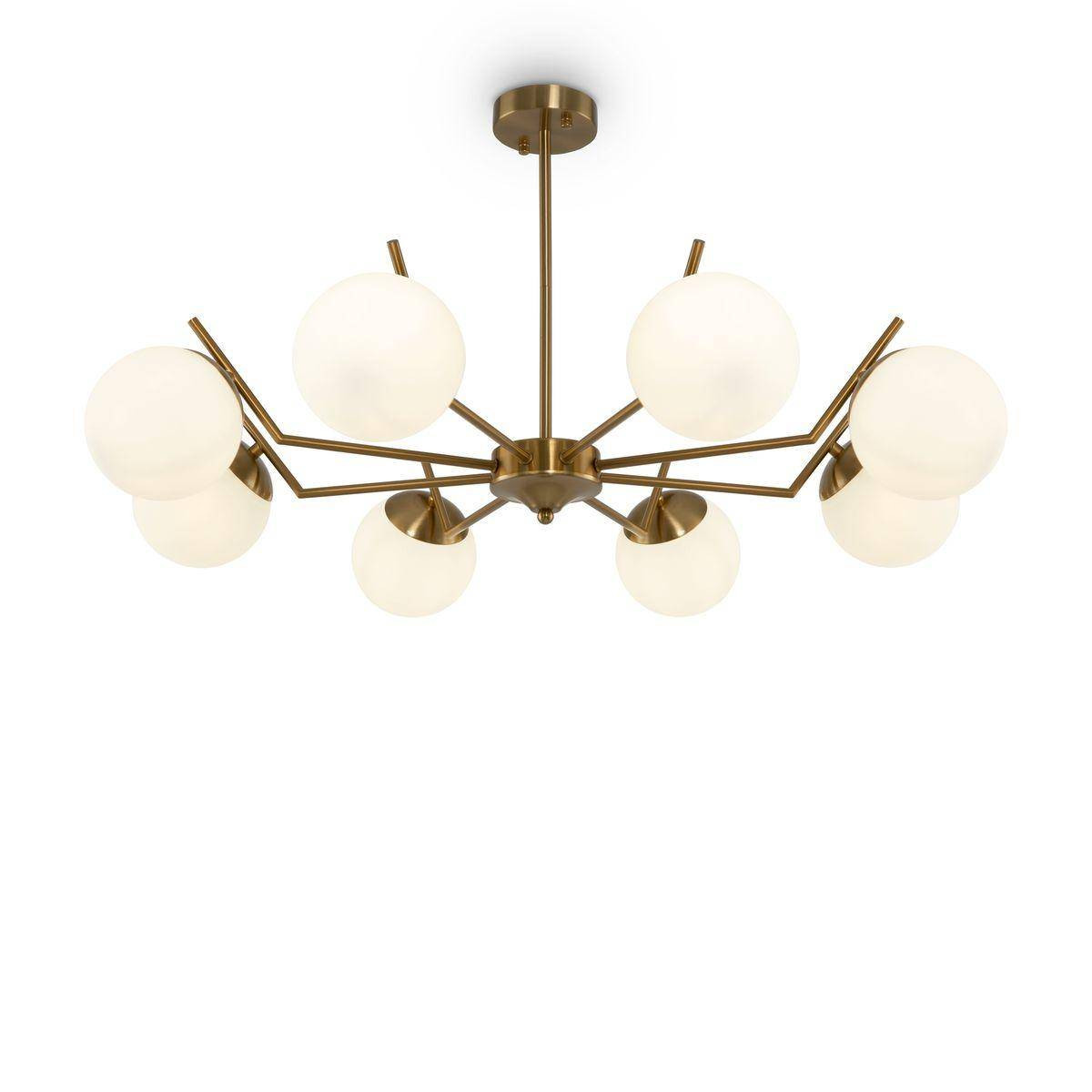 Установка люстры осуществляется просто и быстро, благодаря типу крепления на планку и подвесу на штанге. Направление плафонов в стороны создает равномерное освещение, которое идеально подходит для освещения больших помещений.