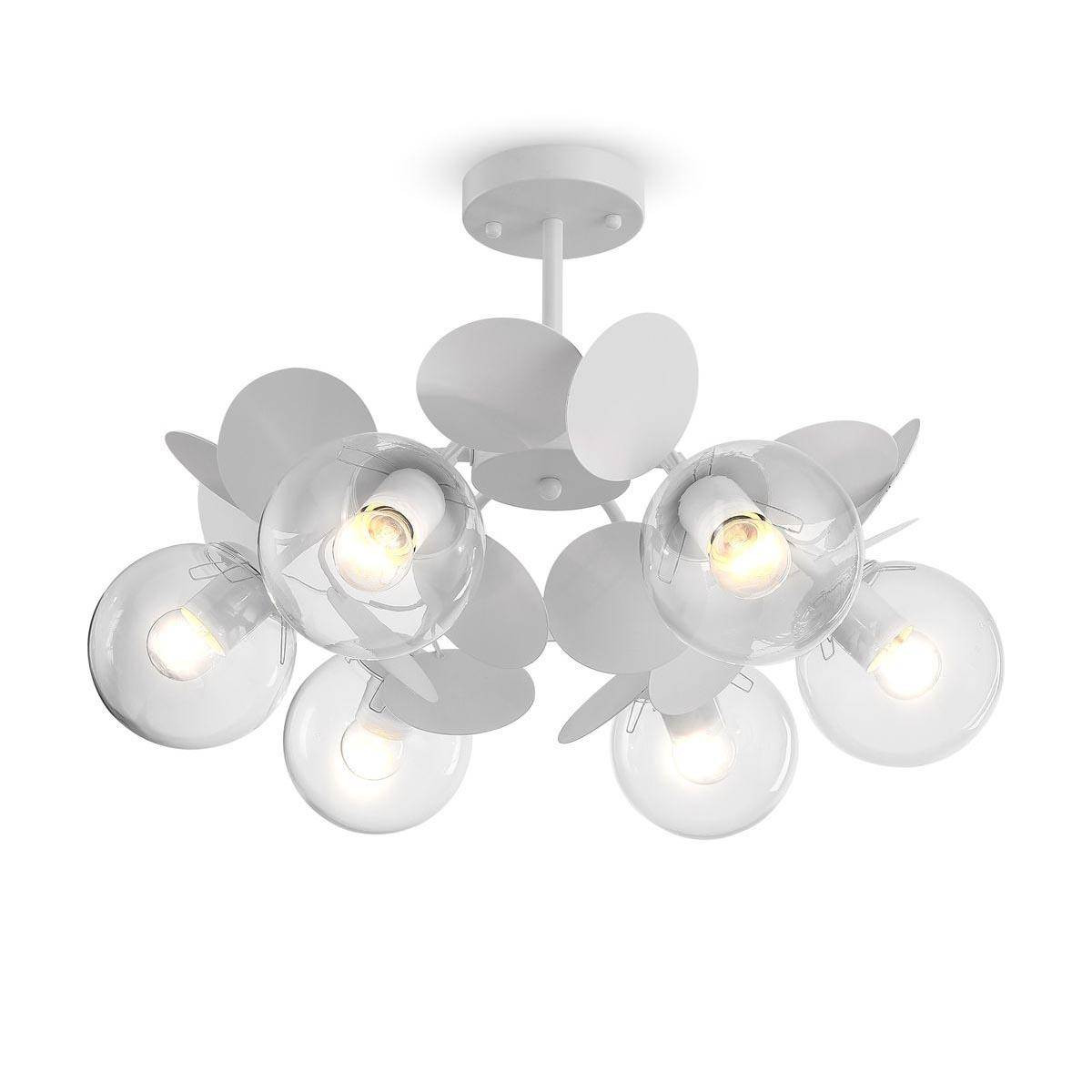 Этот светильник выполнен из первоклассного металла и стекла, что не только обеспечивает долговечность, но и придает оригинальный вид. Белый цвет арматуры и прозрачные плафоны создают воздушное ощущение и позволяют рассеянному свету равномерно заполнять пространство. Стиль Hay-Tech, в котором выполнена люстра, подчеркнёт современный дизайн вашего интерьера.
