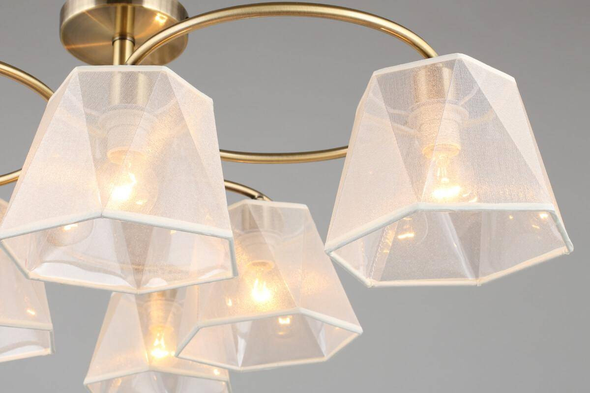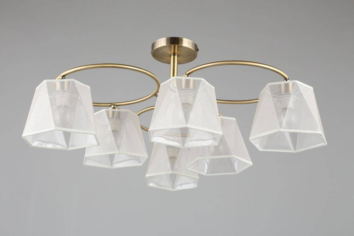 С высотой 300 мм и диаметром 720 мм, люстра обеспечивает равномерное освещение на площади до 12 м², что идеально подходит для гостиной, кухни или спальни. Она использует 6 ламп с цоколем E14, каждая мощностью 40 Вт, и совместима с лампами разных типов, включая энергосберегающие и LED. Таким образом, вы можете легко подобрать освещение, соответствующее вашим предпочтениям.