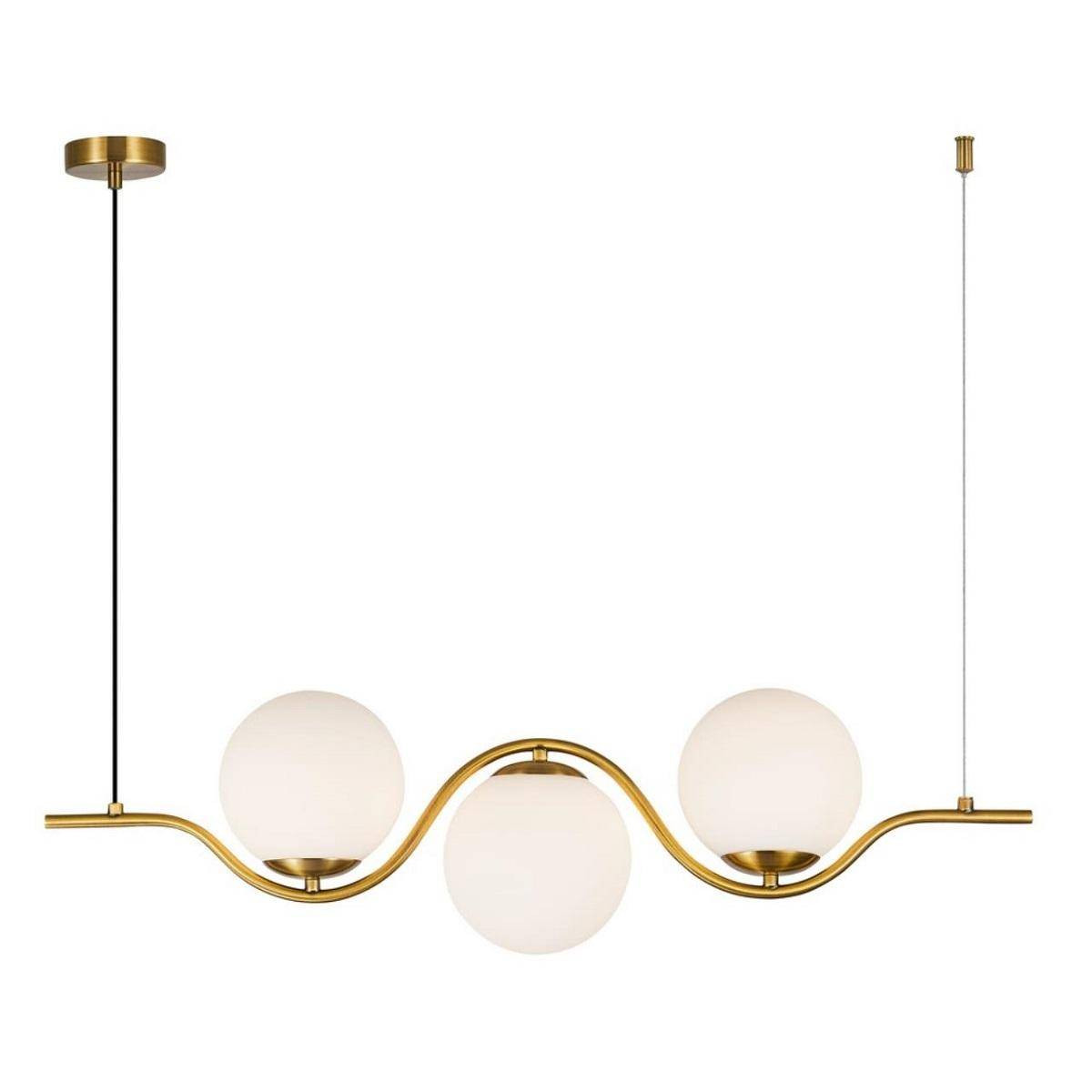 Люстра выполнена в стиле минимализм и отличается оригинальным дизайном, который подойдёт как для гостиной, так и для других помещений, включая спальню или офис. Благодаря элегантному сочетанию латунного покрытия и белых стеклянных плафонов, светильник станет не только источником света, но и стильным акцентом вашего пространства.
