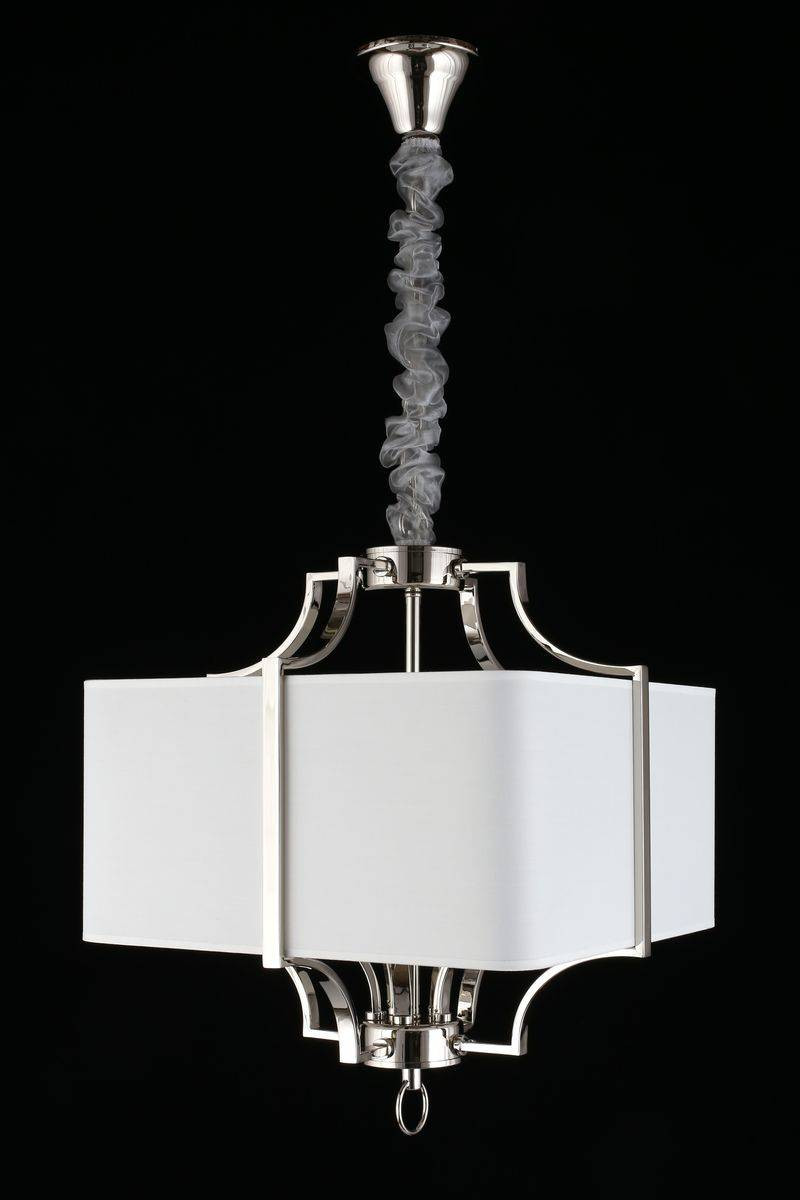 Люстра изготовлена из качественных материалов, в том числе текстиля и металла, что гарантирует долговечность и надежность. Основной материал плафонов — это белая ткань, в сочетании с хромированной арматурой создает эффектный визуальный контраст, а квадратная форма рассеивателя излучает свет вниз, заполняя пространство мягким и приятным светом.