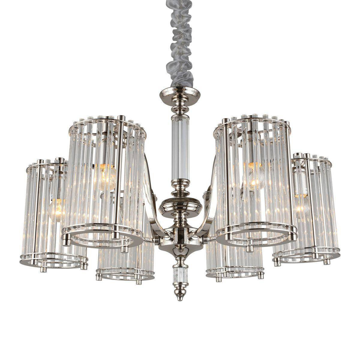 Эта потолочная люстра выполнена в американском стиле с использованием высококачественных материалов, таких как стекло и металл, что гарантирует долговечность и надежность. Благодаря своему элегантному хромированному цвету и прозрачным плафонам, она effortlessly привносит современный дизайн в любое помещение.