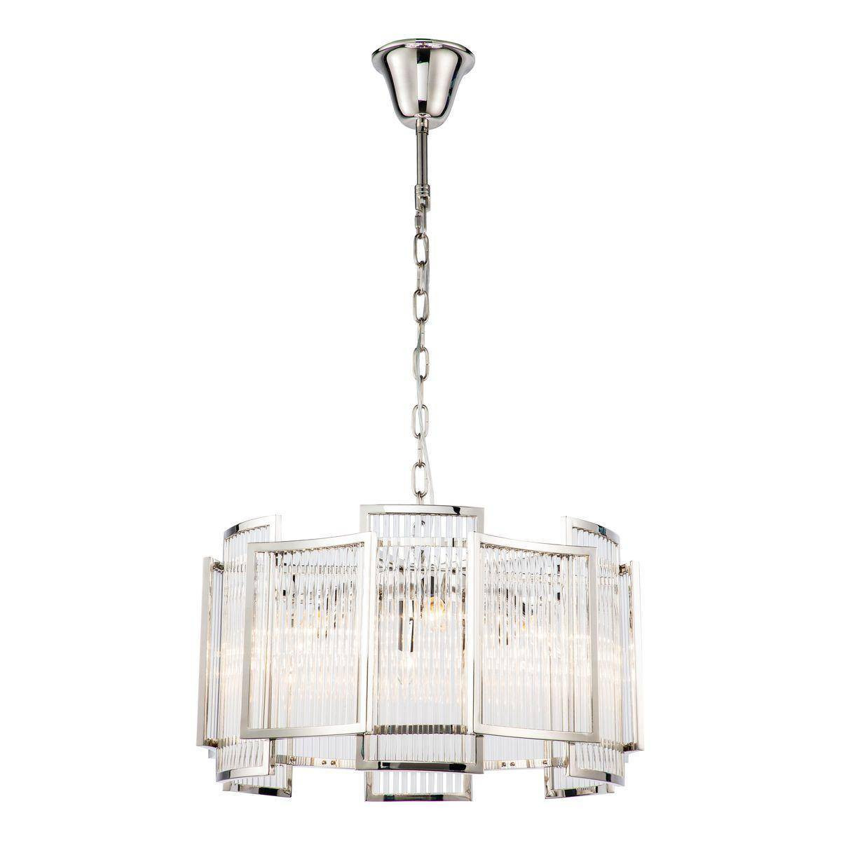 Люстра изготовлена из высококачественных материалов, таких как металл и стекло, что гарантирует долгий срок службы и надежность. Стильный никелевый цвет делает изделие универсальным и легким в сочетании с разнообразными интерьерами. Оригинальный дизайн и форма рассеивателя в виде цилиндра придают светильнику уникальность, что выделяет его среди аналогичных решений в современном каталоге люстр.