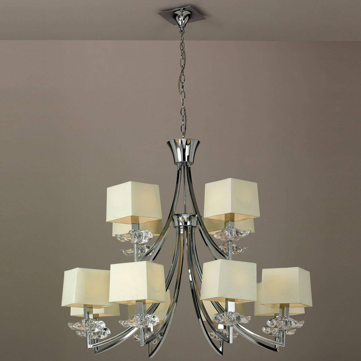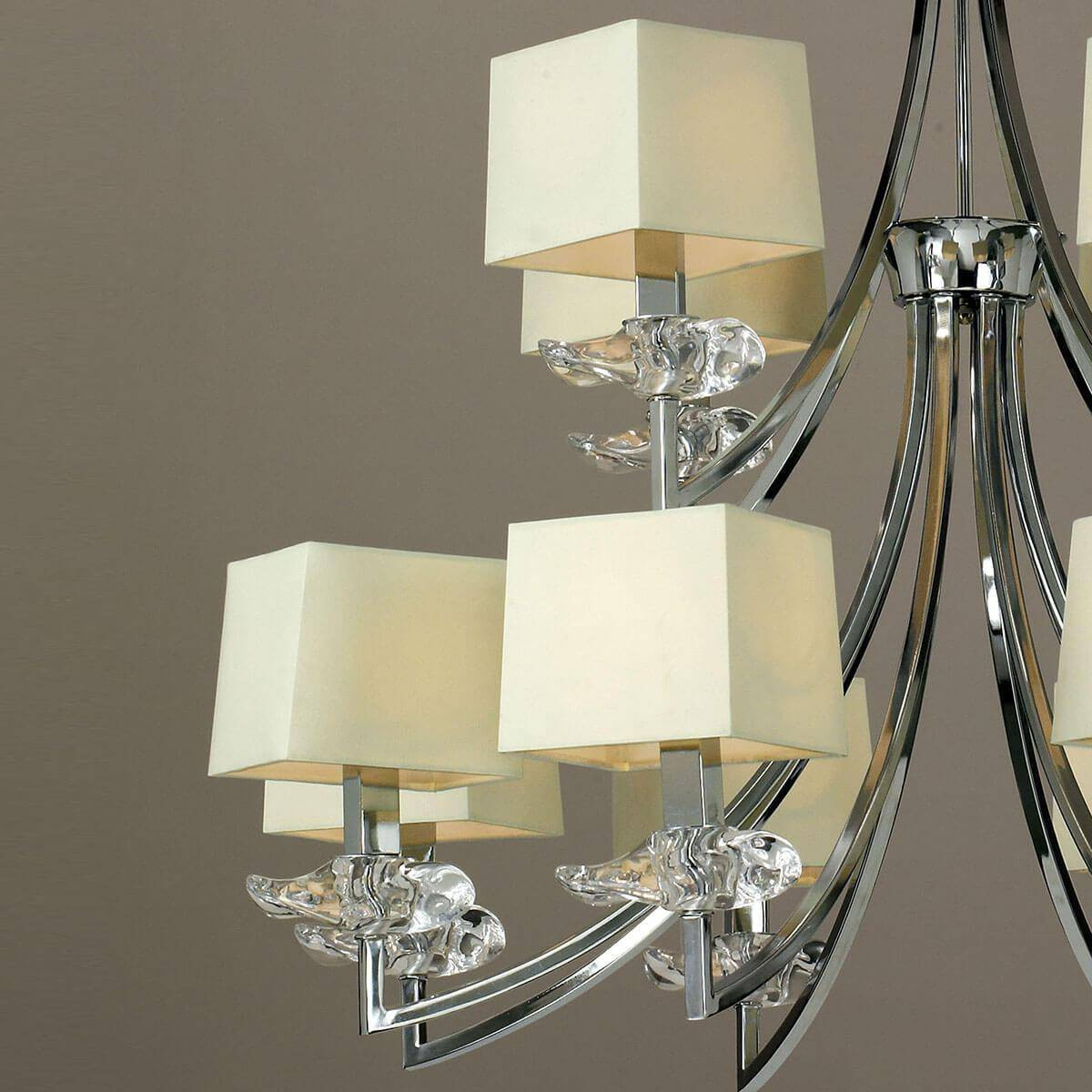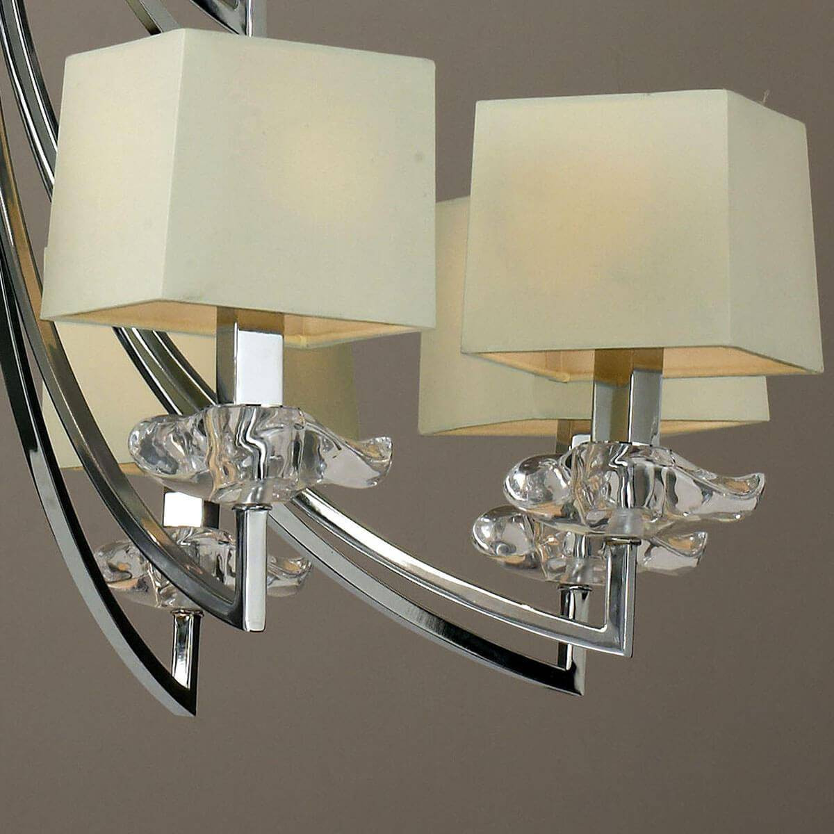Сочетание текстильных материалов с металлом в хромированном исполнении создает оригинальный дизайн, который легко впишется в различные интерьеры. Кремовые плафоны, направленные вверх, гармонично распределяют свет и создают теплую, уютную атмосферу. Эта люстра подходит для освещения как больших, так и малых пространств, добавляя элегантности вашему дому.