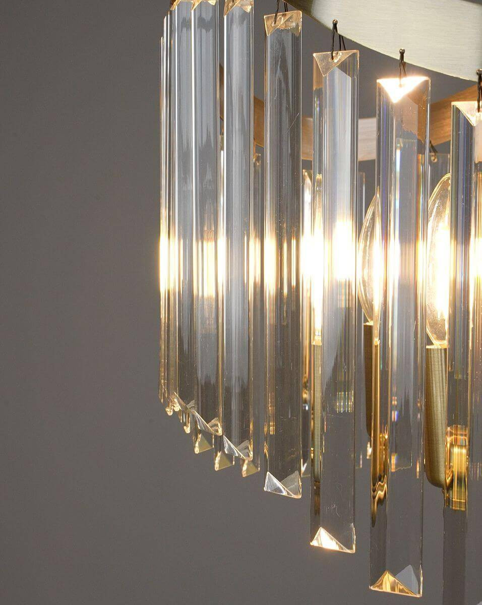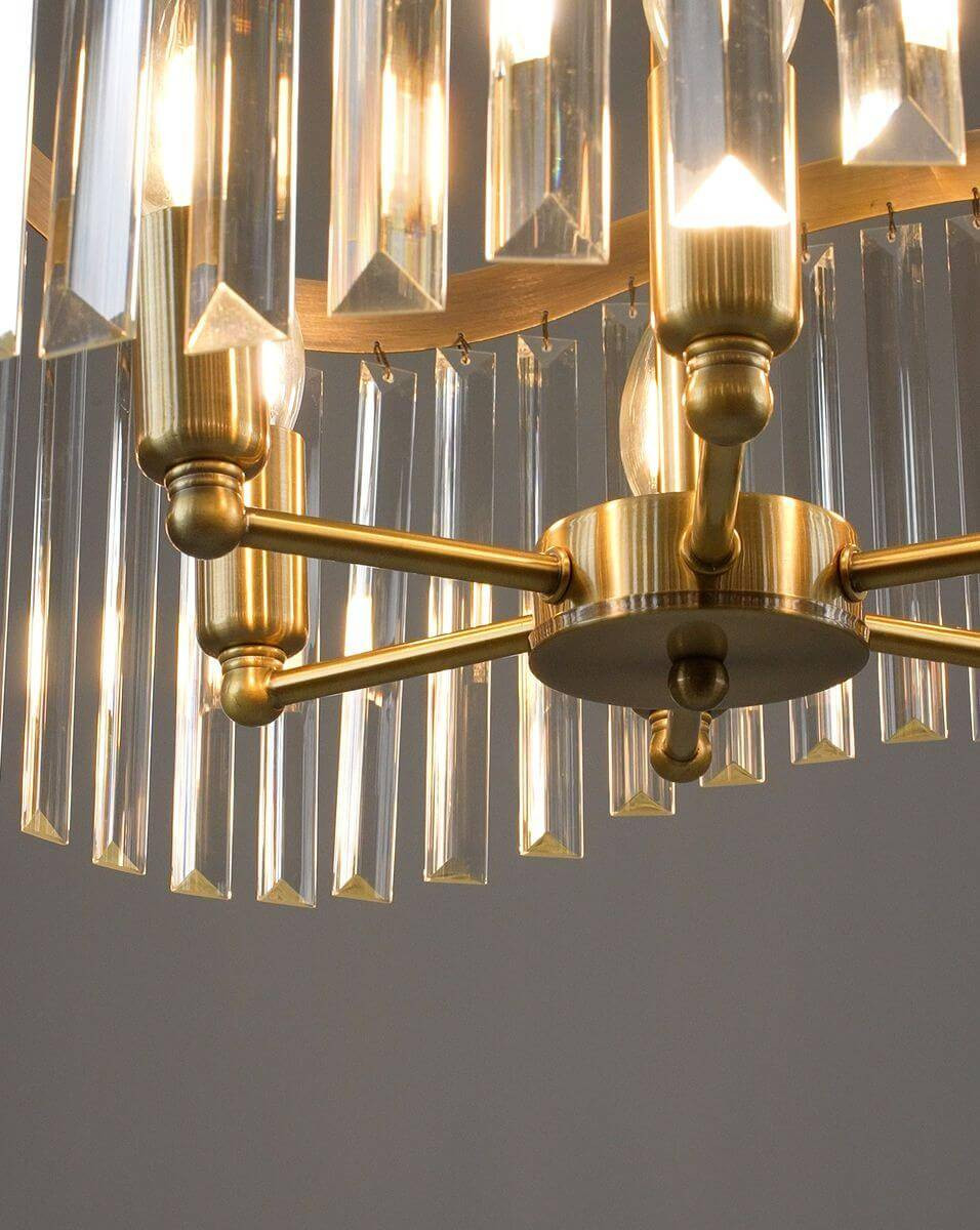 Светильник оборудован 6 лампами с мощностью 40 Вт каждая, что обеспечивает общее освещение в 240 Вт. Такой уровень яркости подходит для комнат площадью до 15 м², как в жилых, так и в офисных помещениях. Люстра прекрасно подходит для спальни, создавая теплую и уютную атмосферу, а также станет стильным дополнением к гостиным и кухням. Подвесной светильник выполнен в хрустальном стиле, что придаёт ему изысканности и элегантности.