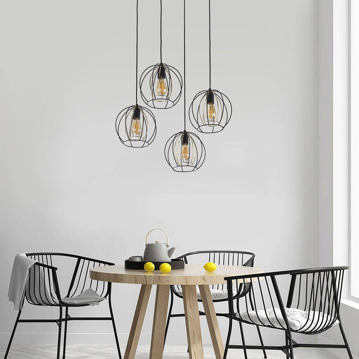 Сочетание черного цвета арматуры и золотистых плафонов создает оригинальный дизайн, который прекрасно вписывается в скандинавский стиль. Люстра имеет высоту 1400 мм и диаметр 550 мм, что позволяет создавать уютную атмосферу в любом помещении, будь то кухня, гостиная или даже офис. Мощность светильника – 240 Вт, поэтому он отлично подходит для освещения площадей до 8 м².