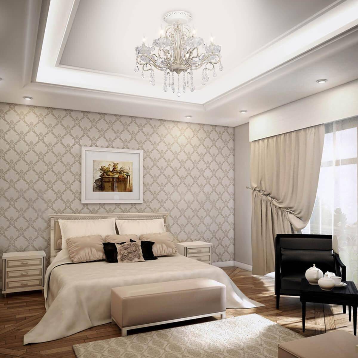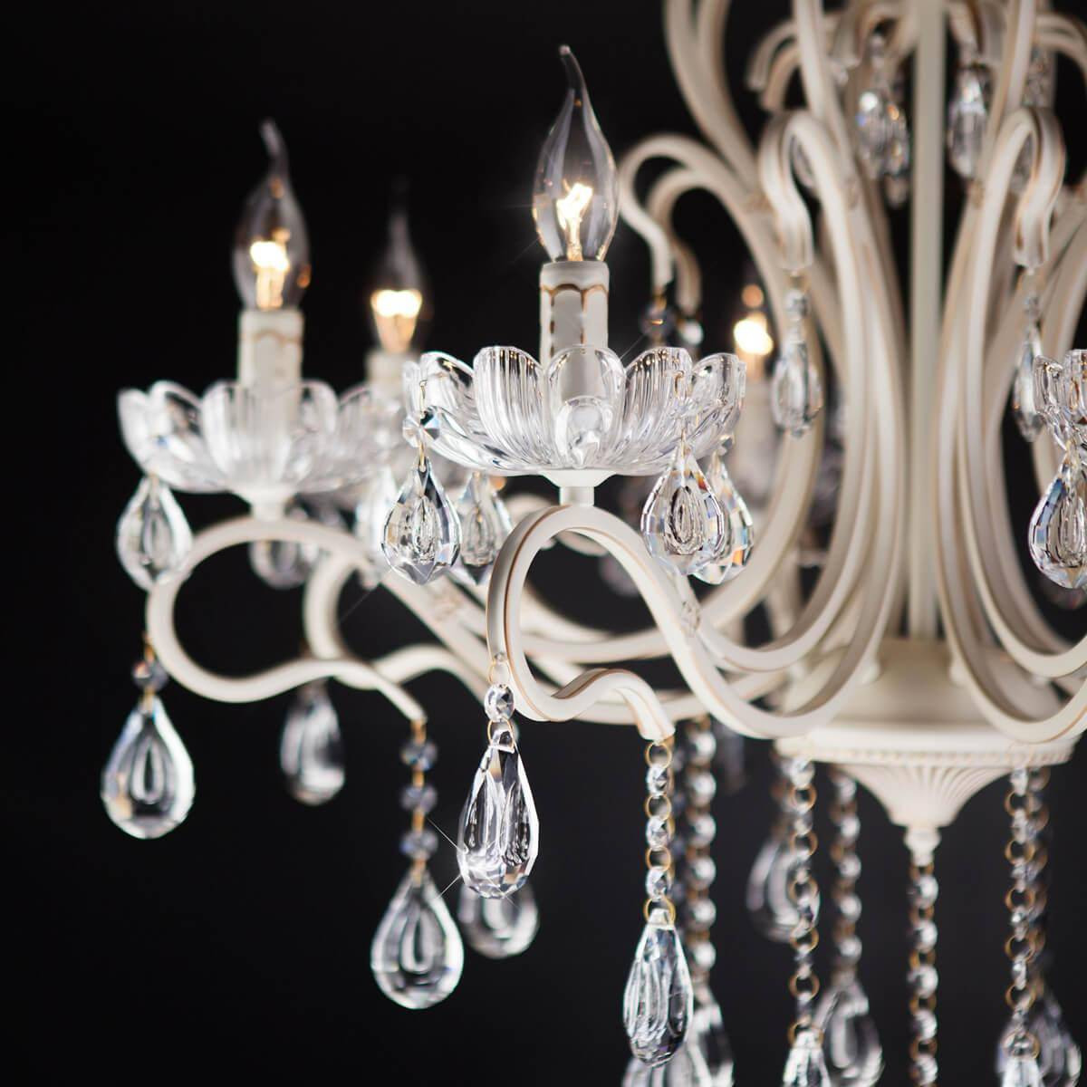 Установка потолочной люстры не вызовет трудностей благодаря простому дизайну, что делает её выбором для тех, кто предпочитает настенный светильник или подвесной светильник. Цвет арматуры и самого светильника выполнен в белом оттенке, что соответствует стилю классика и впишется в любой интерьер.