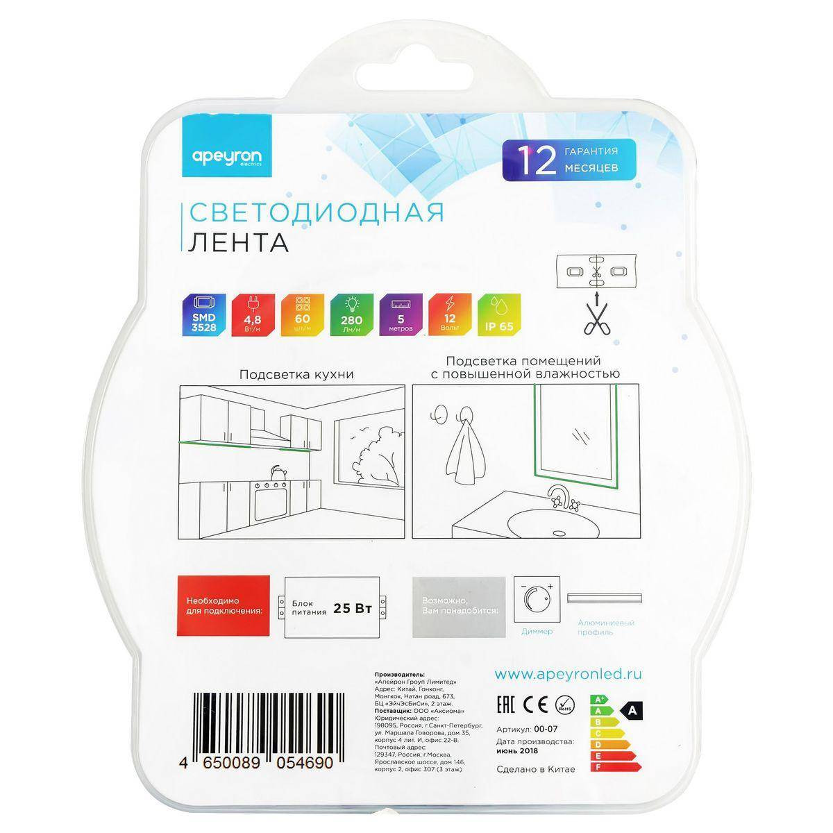 Светодиодная влагозащищенная лента Apeyron 4,8W/m 60LED/m 3528SMD зеленый 5M 07BL
