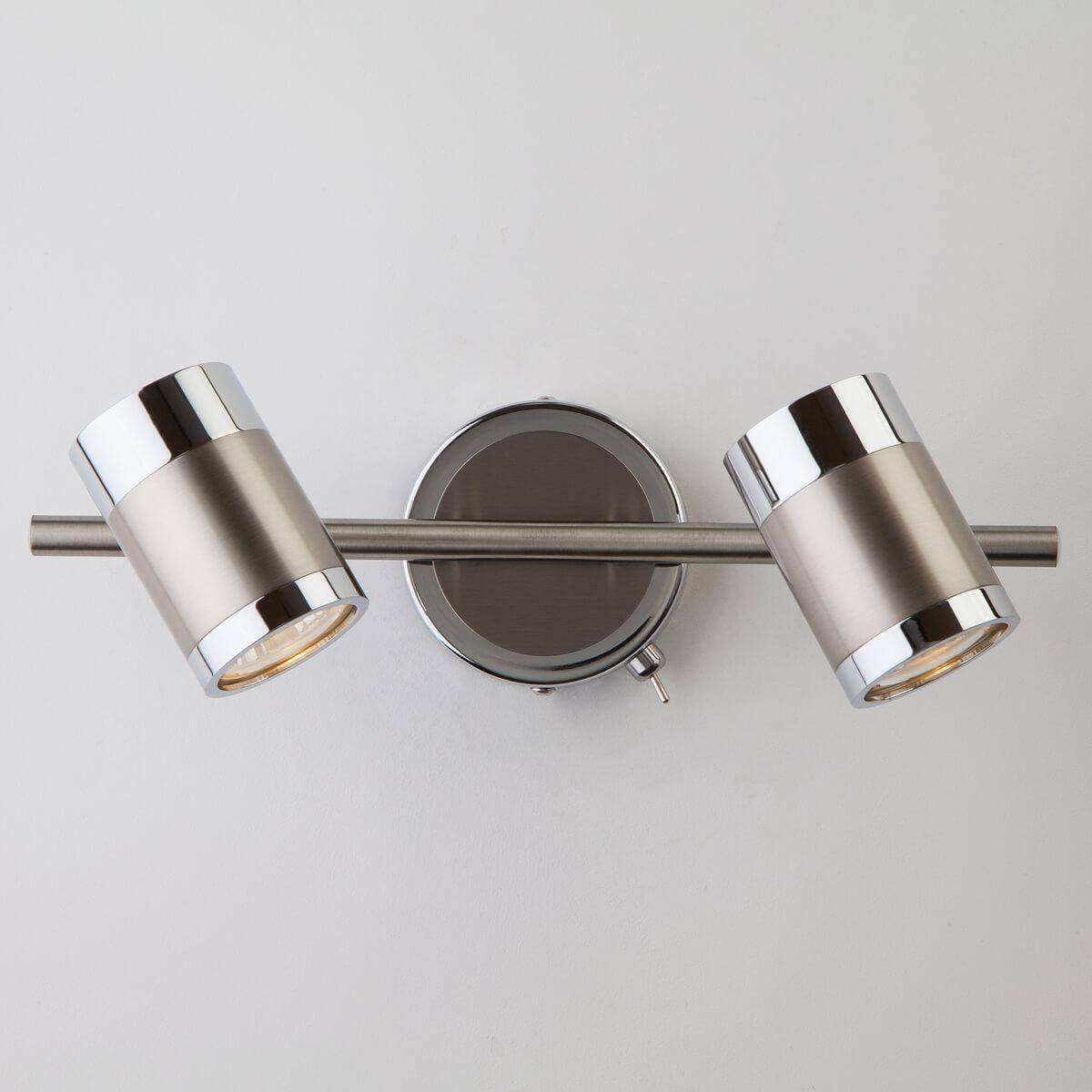 Изготовленный из металла, он оснащен двумя плафонами, совместимыми с лампами GU10. Благодаря мощности 50 Вт на одну лампу, этот настенный светильник обеспечивает необходимое количество света, идеального для различных пространств, включая кухни, гостиные, спальни и даже офисные помещения. Цветовая гамма, включающая никель и хром, делает его универсальным элементом, прекрасно вписывающимся в стиль хай-тек и многие другие.